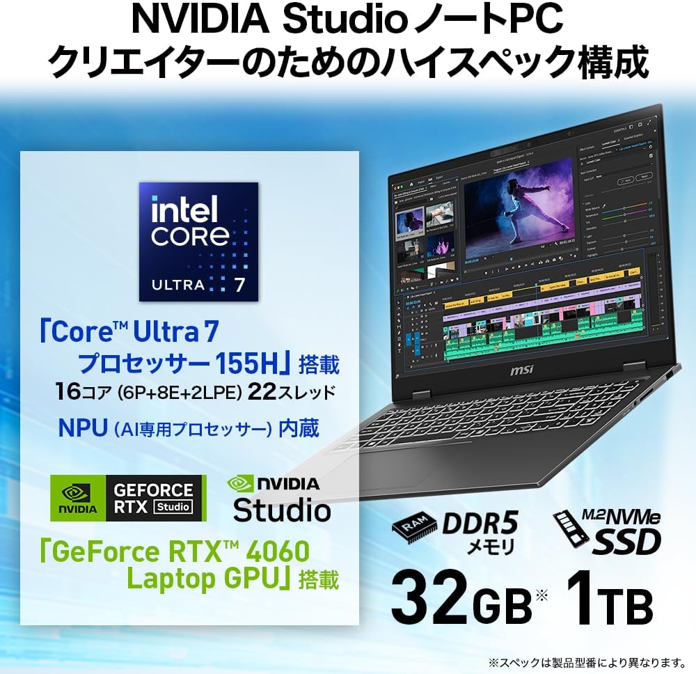 多くの人が「軽くて強いゲーミングノート」を探して悩み続けるのは、軽さと性能が本来トレードオフだから。でもPrestige 16 AI Studioは、その矛盾を見事に破壊しています。RTX4060という強力なGPUは、APEXやVALORANT、Fortniteも設定次第で十分こなすパワーを持ち、動画編集や3DCG、Adobe製品もサクサク。さらにCore Ultra 7がAI処理を含む重作業にも余裕を出し、大容量32GBのメモリがマルチタスクを支え、1TB SSDが高速ロードをさらに後押しします。つまりこのPCは“軽いのに強い”ではなく“軽さを言い訳にしない本気のハイエンド”。こういう構成は本当に珍しいので、検索して辿り着いたあなたは、ほぼゴール地点に立っています。